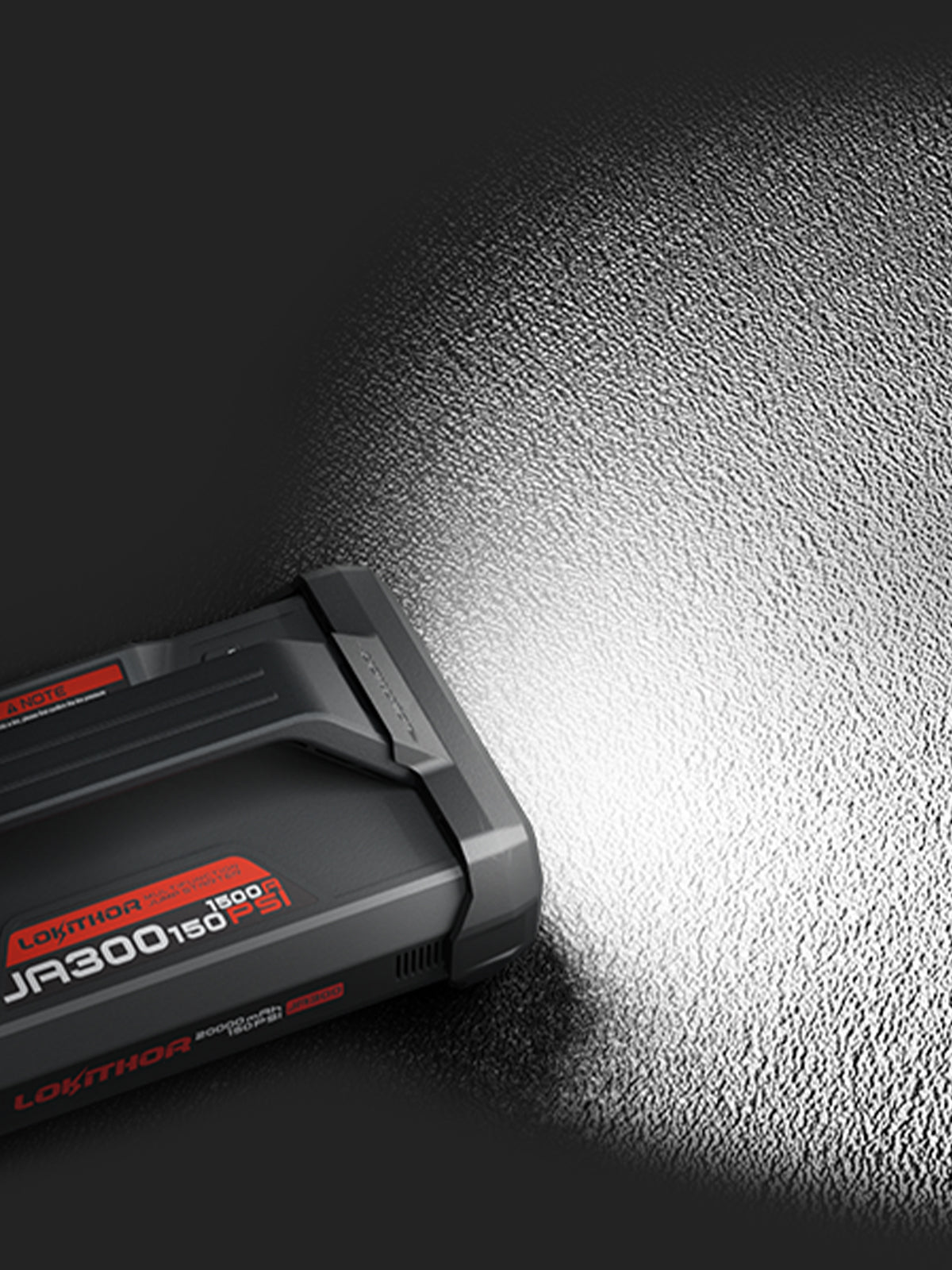 JA series car jump packs combine 4 functions into 1 device, allowing you to use it as a jump starter, an air compressor, a power bank, and an LED flashlight simultaneously.